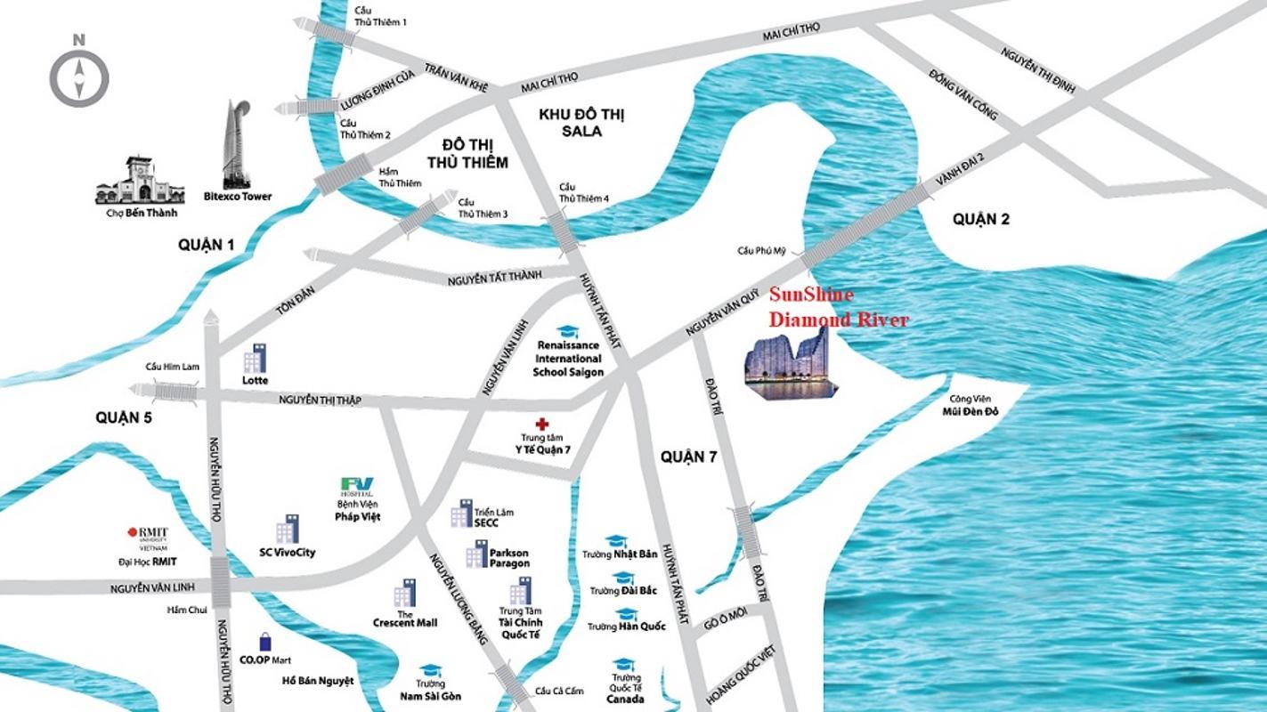 Tọa lạc ngay vị trí đắc địa, sát bên ngã ba sông Sài Gòn giao với sông Đồng Nai, cạnh cầu Phú Mỹ, 3 mặt kế cận nguồn nước mang lại sinh khí lộc tài, khu căn hộ cao cấp và trung tâm thương mại Sunshine Diamond River hứa hẹn mang đến phú quý, an lành cho những chủ nhân chọn nơi đây làm chốn an cư lạc nghiệp.