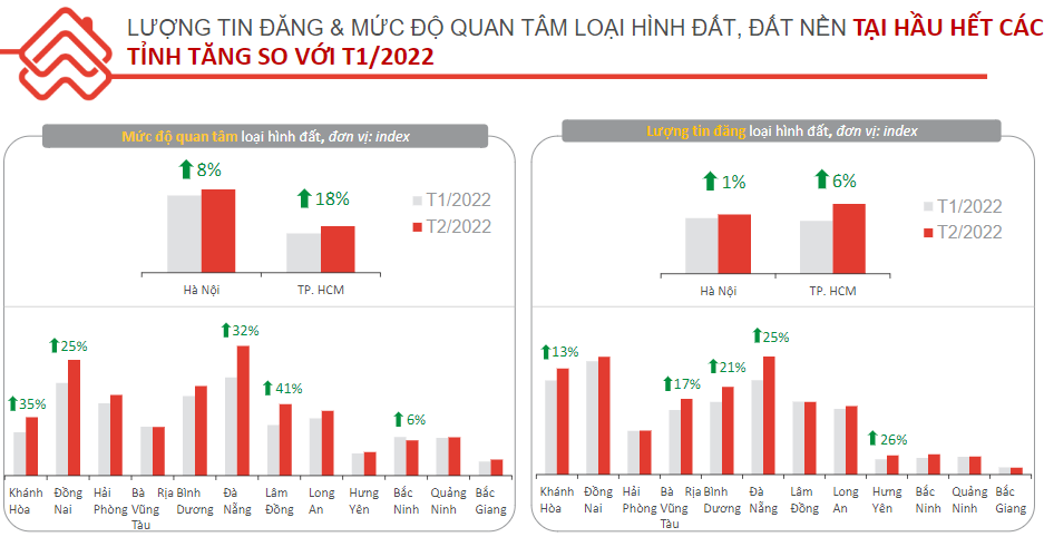 Báo cáo thị trường tháng 2/2022 của Batdongsan.com.vn công bố cho thấy, lượng tin đăng và mức độ quan tâm loại hình đất, đất nền dự án tại TP.HCM và nhiều tỉnh thành trên cả nước có động thái tăng mạnh ngay sau kỳ nghỉ Tết âm lịch, đặc biệt là tại các tỉnh thành miền Nam và Nam Trung Bộ.